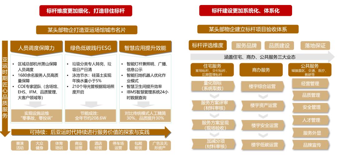 另一方面,标杆层面更加细化,打造非住标杆。例如,在亚运会场馆服务过程中,中建八局、融创服务等物企协助城市政府打造城市名片,赢得了政府机构的一致好评。