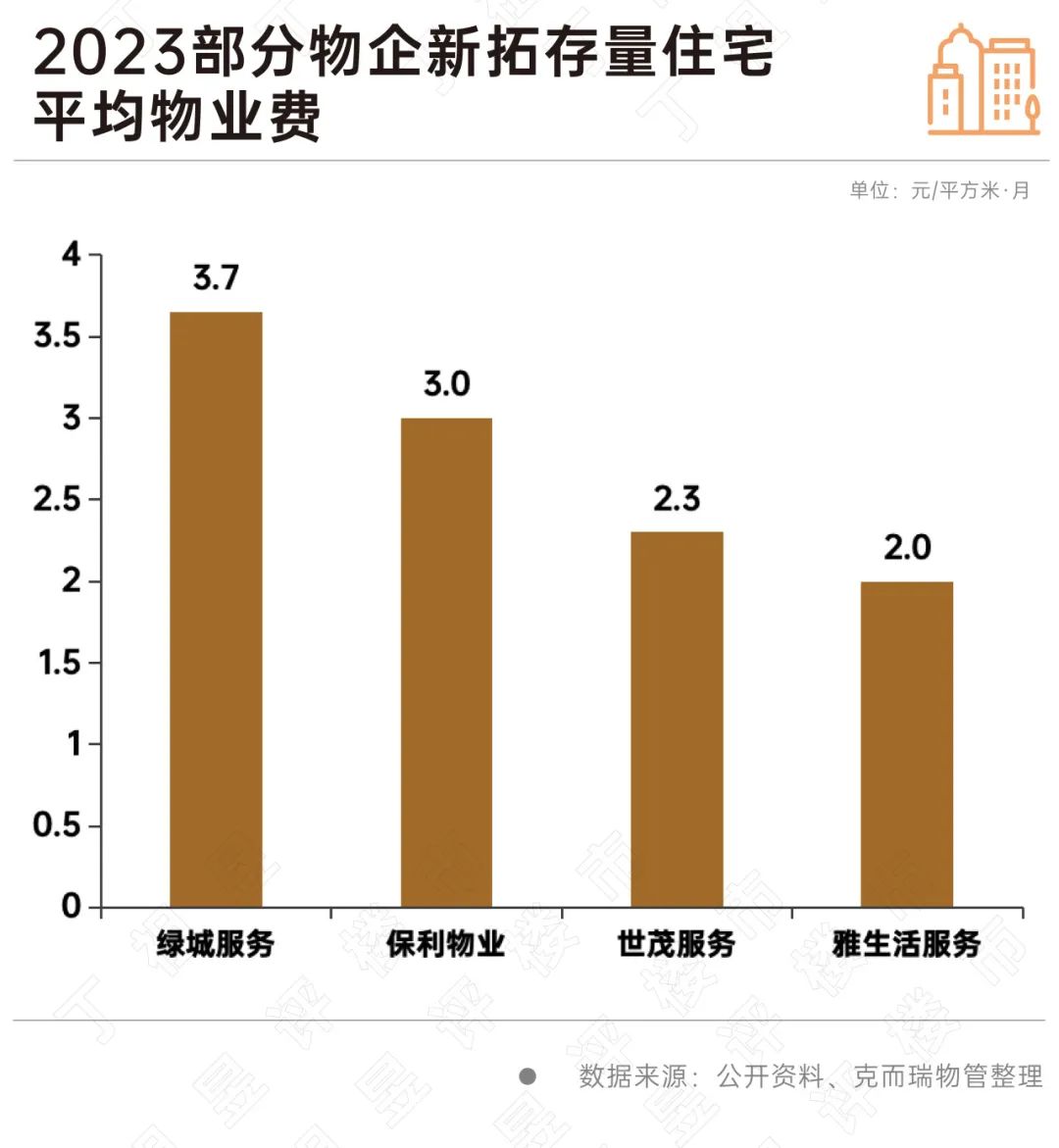 企业投拓战略基本趋同,扩大重点关注中端项目,导致中端项目投拓竞争日益激烈。2023年,上市物企新拓存量住宅物业费用主要集中在每平方米2-4元/平方米的范围内,例如保利物业2023年扩大存量房屋平均物业费用3元/平方米月。