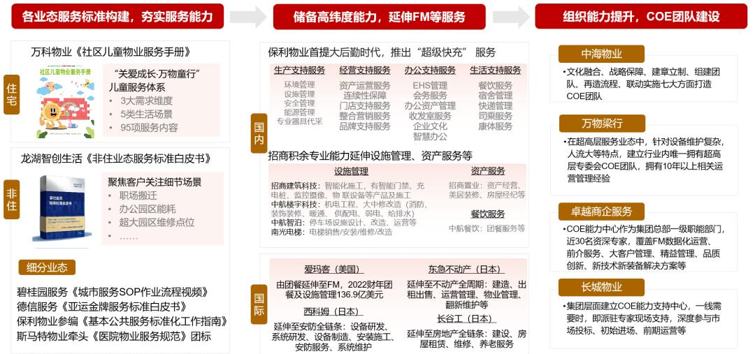 第二,储备高纬度能力,延伸FM等服务。比如保利物业升级传统IFM服务,在商业领域推出“超快充模式”服务体系,为用户提供生产、运营、办公、生活等全链条的持续保障,让客户更好地专注于主营业务,提高生产效率和管理效率。另一个例子是,在专业技能延伸到设施管理、资产服务、增值服务等领域,开设各类专业公司在不同领域承接业务,完成了明确的专业分工和全面覆盖的产业链。
