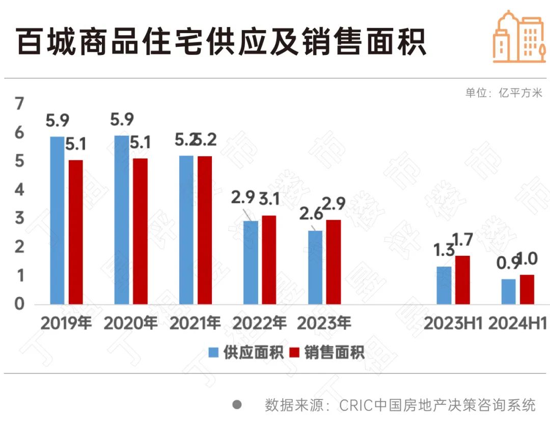 2023年,百城商品房供应面积低至2.6亿平方米,低于2020年5.9亿平方米。;与2021年高点的5.2亿平方米相比,销售面积低至2.9亿平方米,下降43%。2024年上半年,百城商品房供销面积分别为0.9亿平方米和1.0亿平方米,比去年同期下降34%和39%。