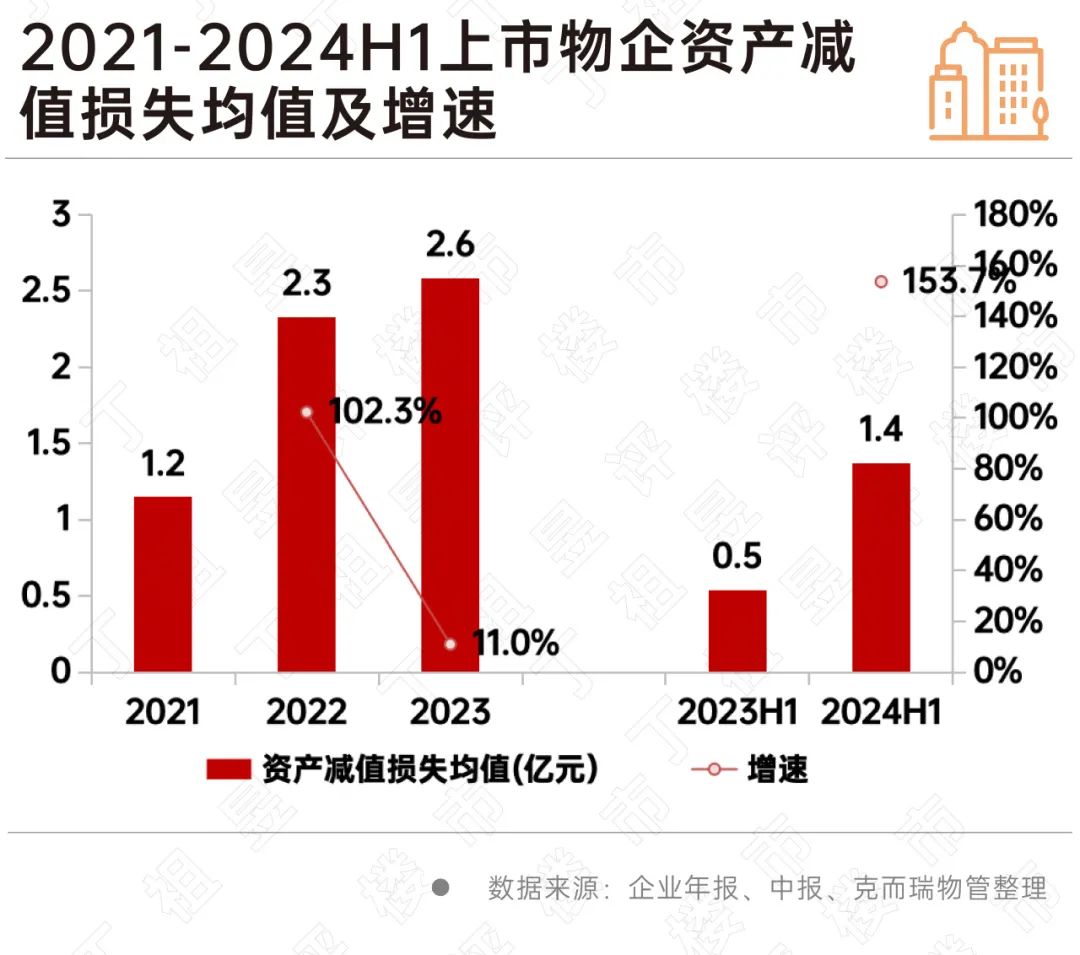 与去年同期的0.5亿元相比,2024年上半年上市物企平均资产减值损失达到1.4亿元,增长153.7%。个别企业大额记提仍然是利润损失的主要原因。