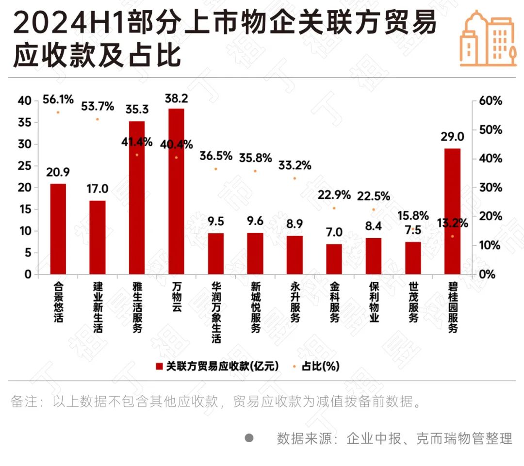 为了抑制应收账款的增长速度,许多企业在2024年上半年积极减少与关联方的交易。但部分公司关联方应收账款占比仍处于领先水平。比如合景生活和建业新生活占比超过50%,雅生活服务和万物云占比也超过40%。