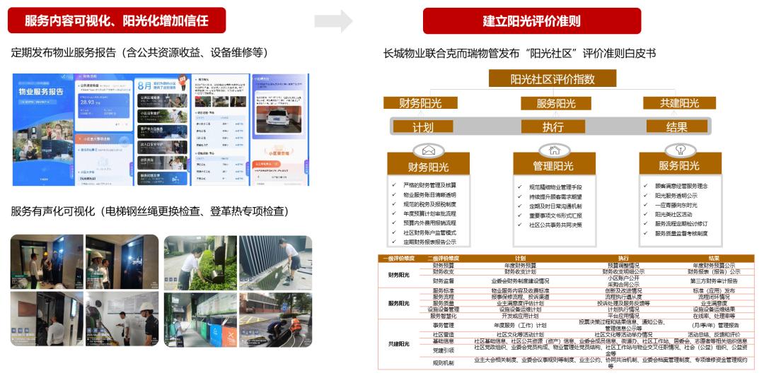另外,建立阳光评价标准。比如长城物业积极探索阳光物业管理模式,通过财务阳光、服务阳光、共创阳光等关键措施,联合克而瑞物业管理发布《阳光社区评价标准白皮书》,提高企业与业主的信任关系。