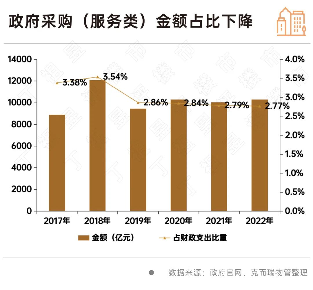 第一,政府预算下降。2018-2022年,服务类政府采购金额由3.54%缓慢下降至2.77%,净下降0.77%。%。