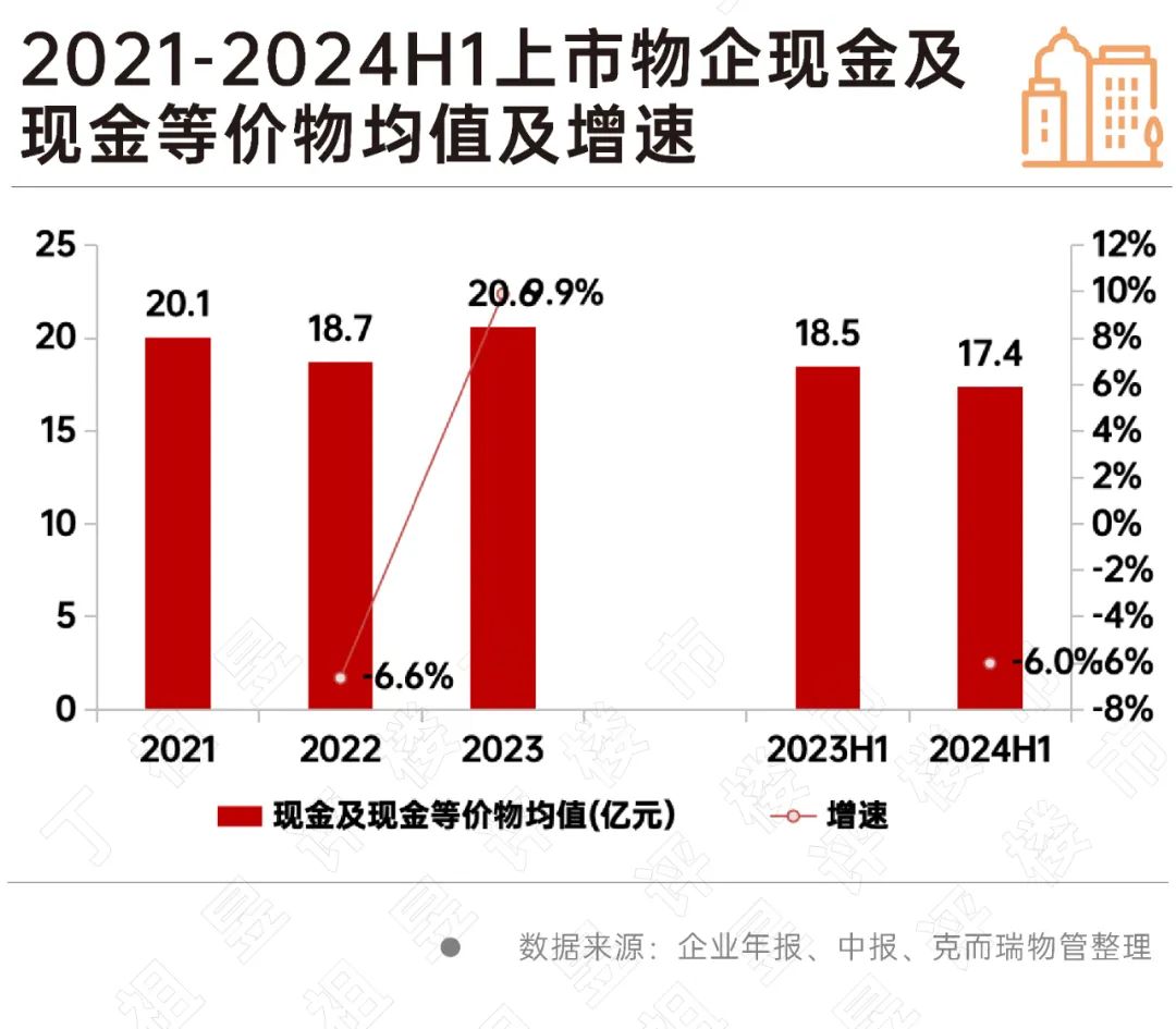 就现金和现金等价物而言,2024年上半年,65家上市物企的现金和现金等价物均为17.4亿元,同比下降6%,近60%的公司现金和现金等价格下降。