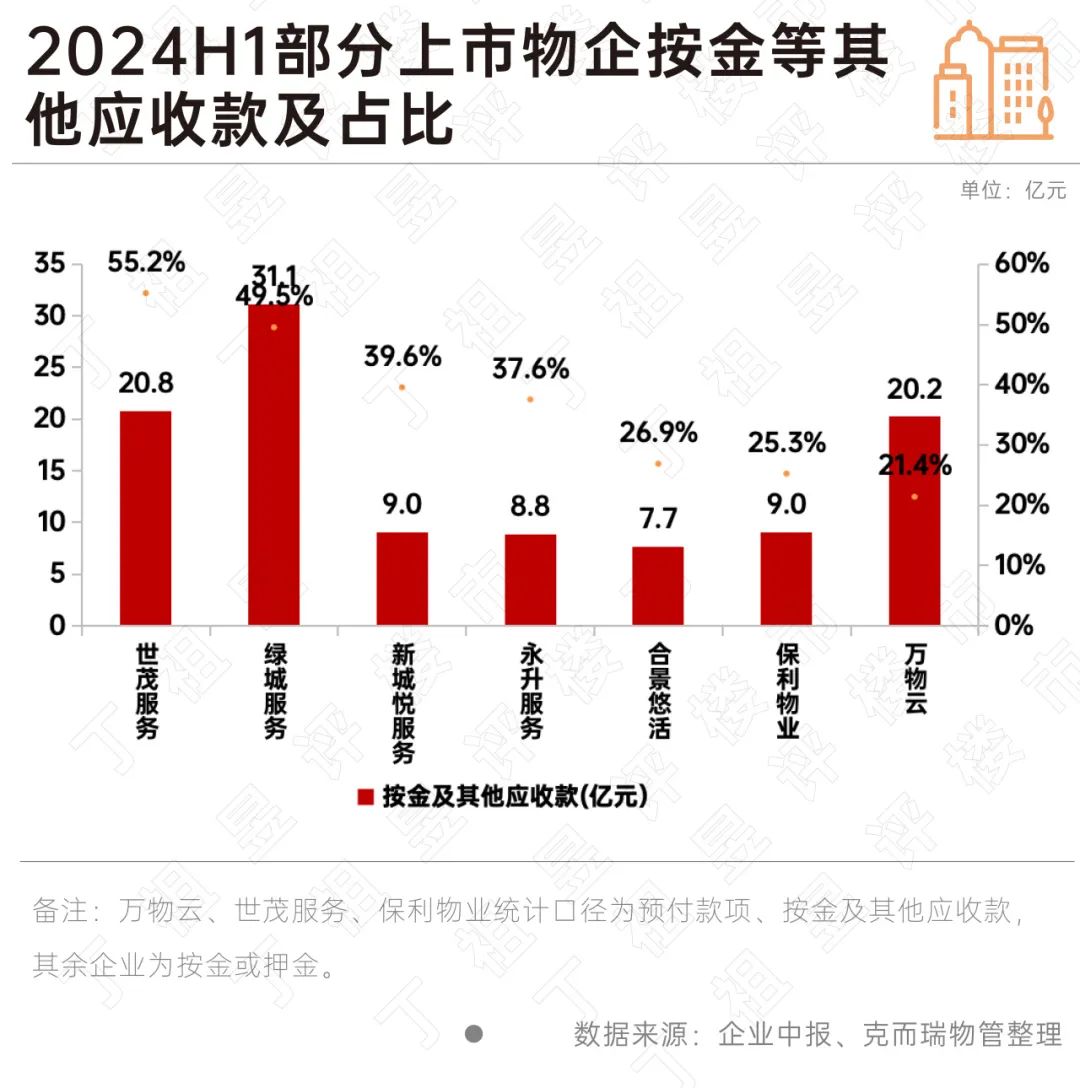 随着关联方应收账款风险的增加,数亿甚至数十亿元的停车位按金开始影响企业的现金流。2024年上半年,许多企业的预付款、按金等应收款占应收账款和票据的比例仍然很高。例如,世茂服务和绿城服务的比例都在50%左右。