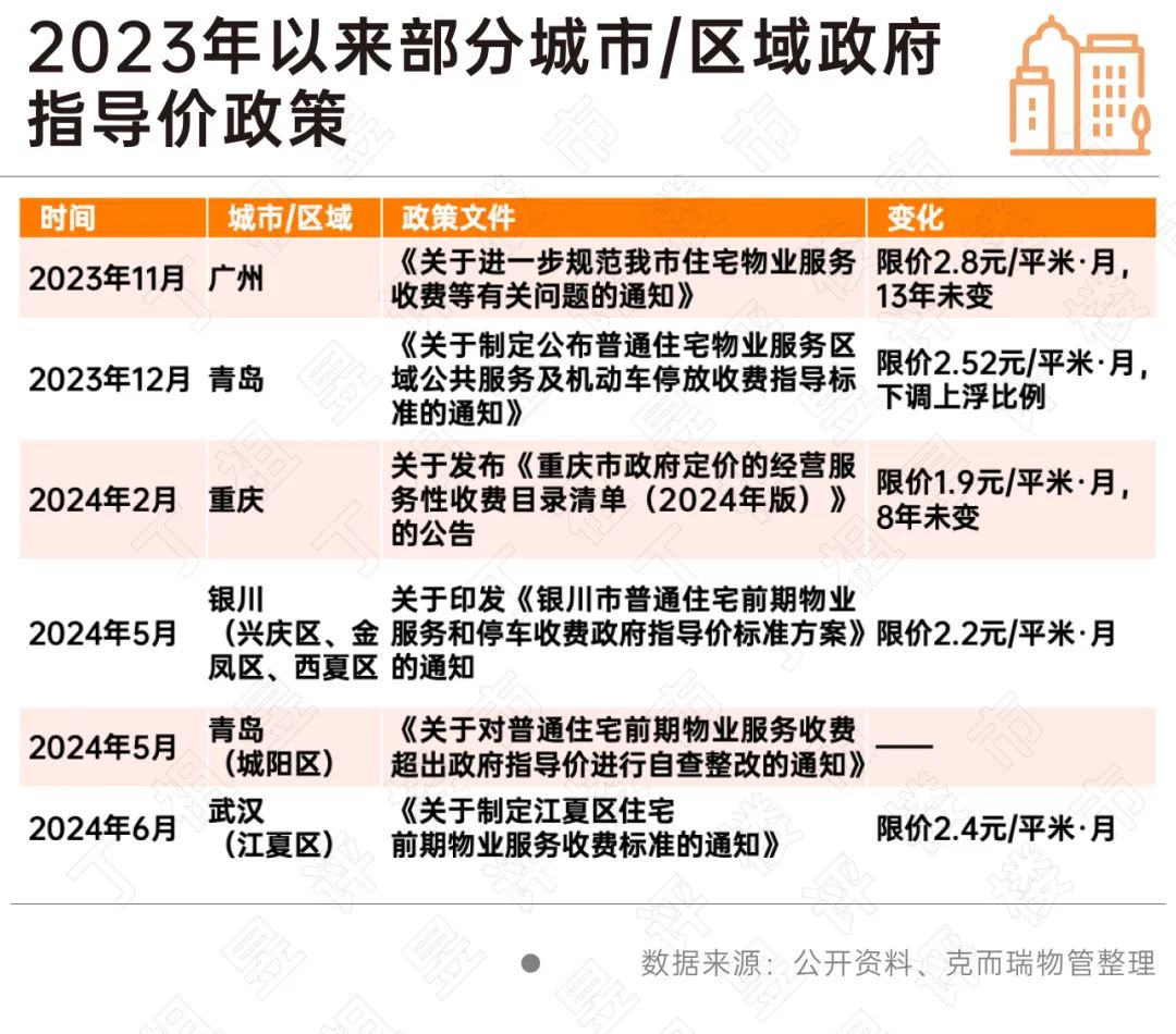 2023年以来,广州、青岛、重庆等城市陆续公布物业服务收费标准,多年来政府指导价一直保持一致。比如在广州,住宅一级前期物业服务收费最高不超过2.8元/平方米,持续13年。再比如重庆,前期物业服务收费最高1.9元/平方米,政府指导价持续8年。