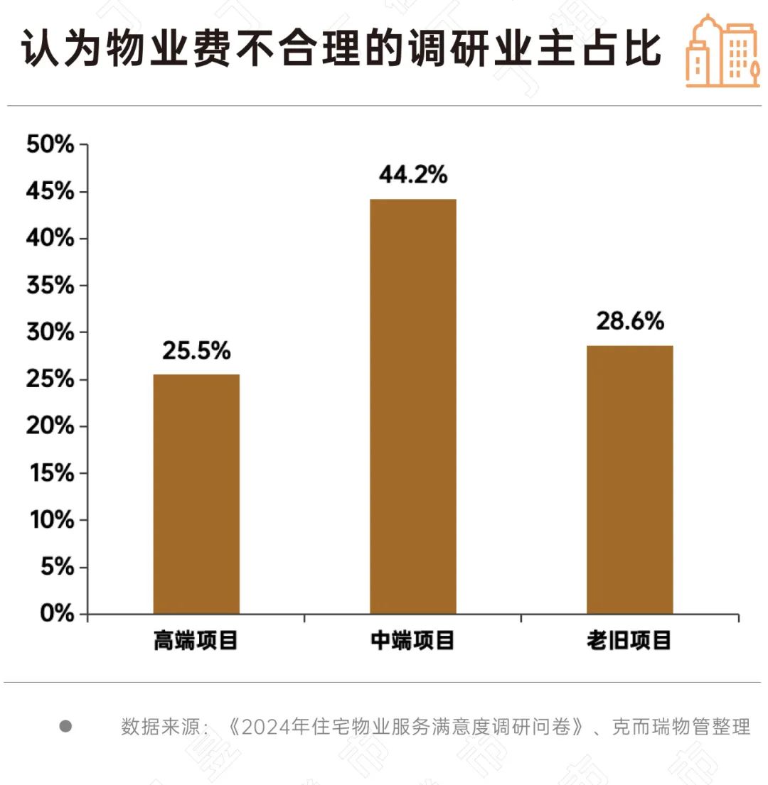 根据克而瑞物业管理《2024年住宅物业服务满意度调查问卷》的数据,中端项目中物业费用不合理的业主比例高达44.2%,明显高于认为物业费用不合理的业主,说明中端项目物业费用降价风险高。