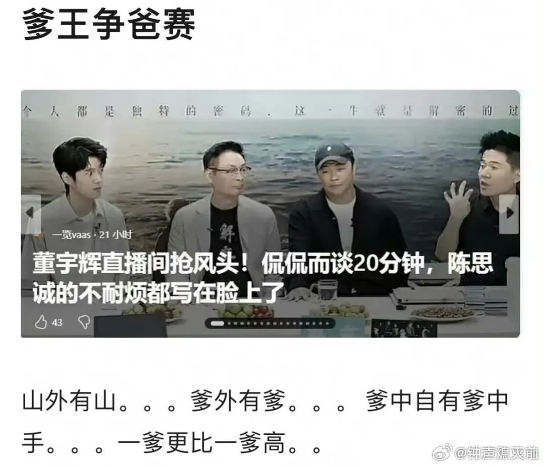 8月21日,李娟参观了董宇辉的直播间。直播结束后,“李娟表示感谢您的伟大赞美”冲上热搜,不久前董宇辉与《解密》剧组的联动让他们变得醇厚。有一段时间,董宇辉从一个大家都称赞的诗意卖货变成了一个大家都不喜欢的爹味代表。网友们直接扩散了他和陈思诚在同一个框架里的视频编辑,发言飘飘,让互联网爹味代表陈思诚失去了光彩。