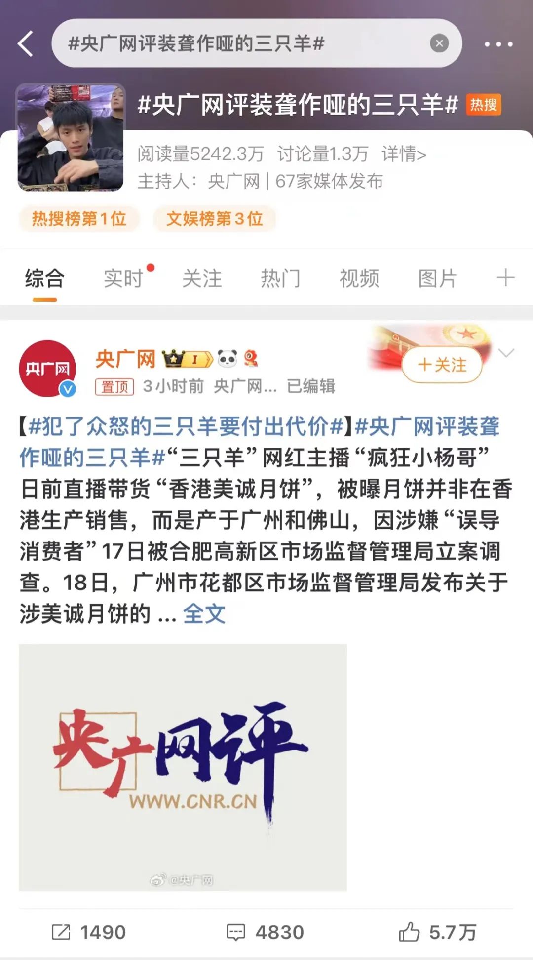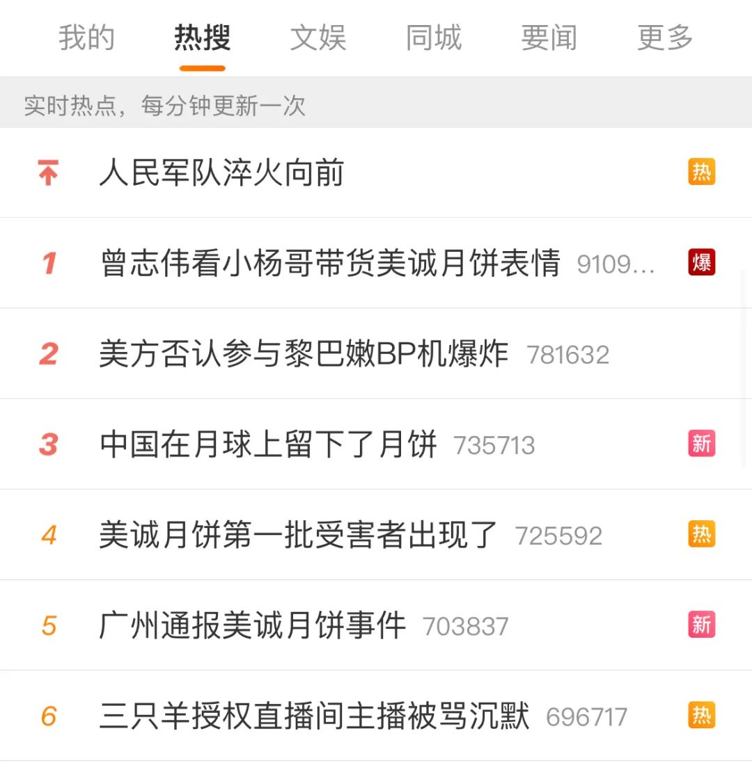 今天热搜榜第一:#央广。com假装迷茫的三只羊#。从中秋节到中秋节,三只羊美诚月饼虚假广告的火还在燃烧。今天央广网发帖,直言三只羊要积极回应相关问题,不要想着假装迷茫。“真诚道歉,积极赔偿,惩罚整改,才是解决问题的正确态度”。