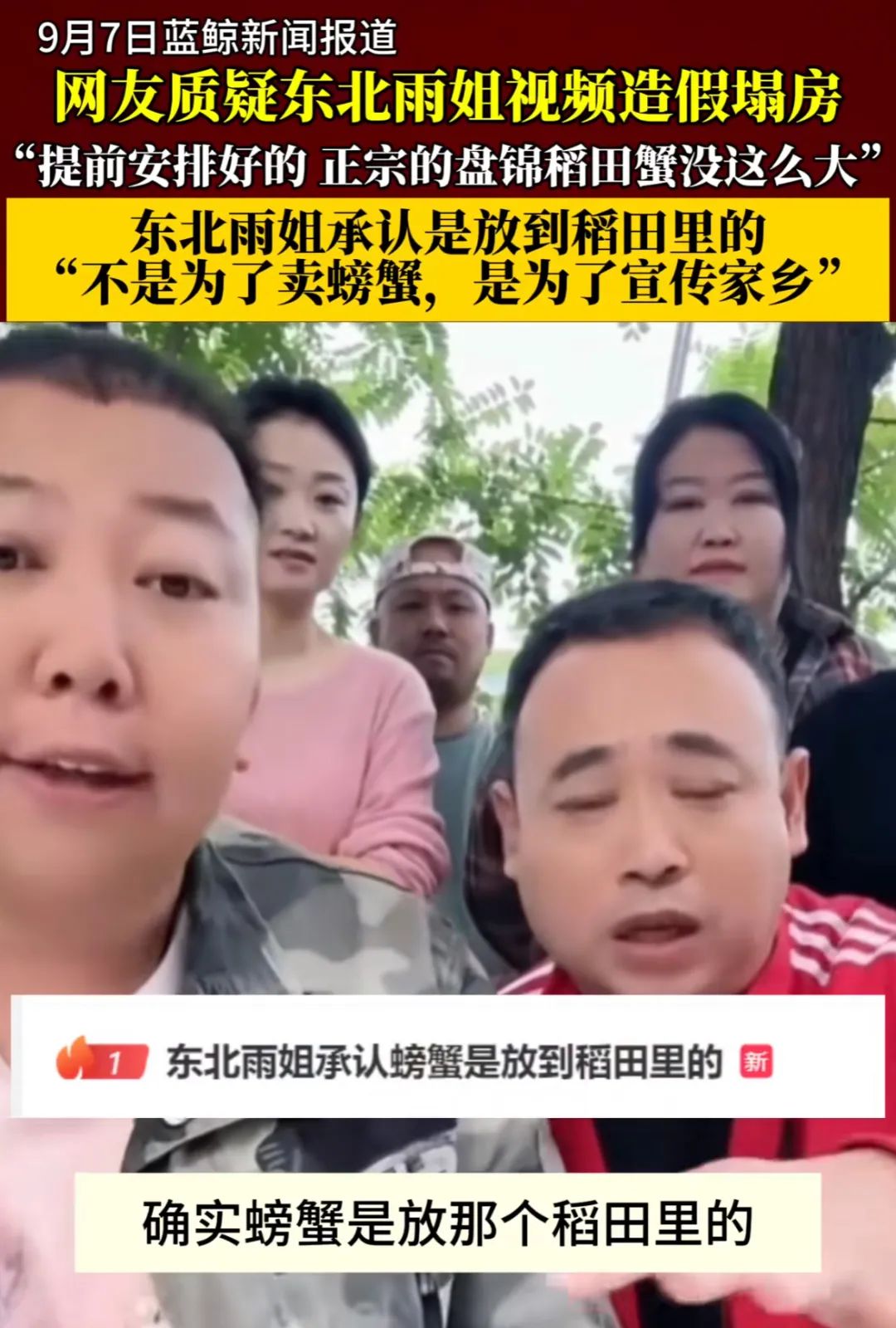 9月4日,“东北雨姐”抓盘锦稻田蟹的视频被质疑造假。对此,“东北雨姐”随后回应称,视频受官方平台丰收节邀请,旨在宣传家乡盘锦河蟹。由于活动时间和晚上拍摄不方便(盘锦稻田蟹真正合适的捕捉时间),造成误解。