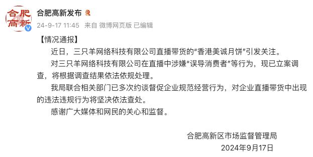 9月17日,合肥市高新区市场监督管理局发布情况报告:近日,三羊网络科技有限公司直播带来的“香港美诚月饼”备受关注。现已立案调查三羊网络科技有限公司涉嫌在直播间“误导消费者”,将按照调查报告依法处理。
