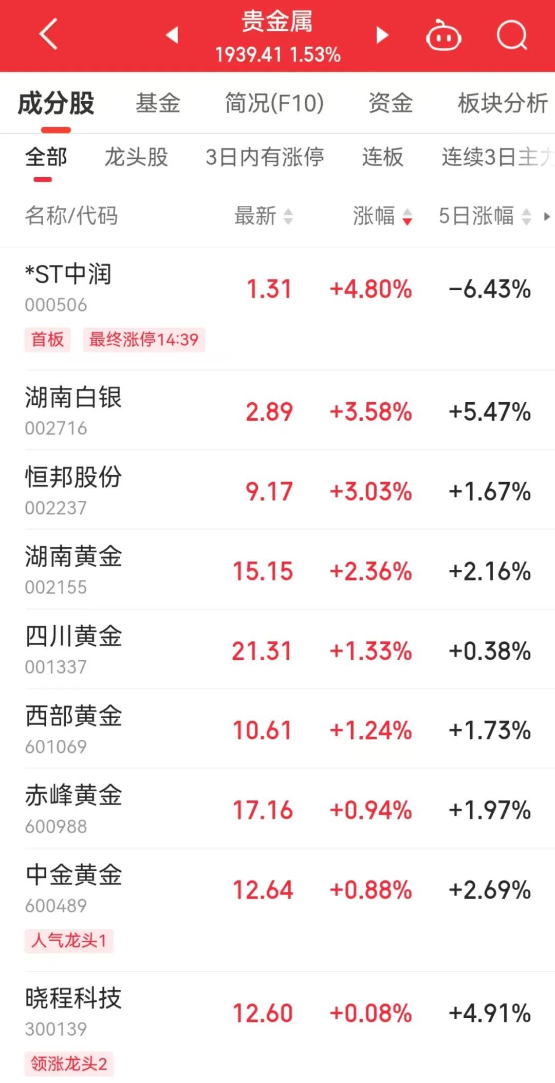 今天,黄金股继续反弹,该板块近日逐步企稳修复。截至今日收盘,*ST中润日线跌停,湖南白金涨幅超过3%,恒邦股份和湖南黄金涨幅超过2%。