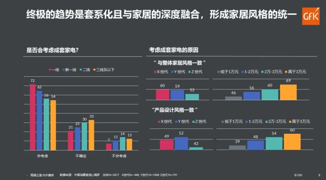 市场调研机构GFK还指出,72%的一线城市受访者表示,他们正在考虑购买一套完整的家用电器,这意味着一套完整的嵌入式家用电器已经成为中国家用电器的确定性演变方向。在这些因素中,高端市场是当前行业的机遇。在报告中,GFK指出,中国家电市场存在着一个重要的“结构性机会”,高端客户更愿意为更好的生活支付更高的产品溢价。在股票房改造的趋势下,市场和用户的需求分化会更加明显,高端客户对生活质量的要求也会走在前列,这也是家电企业不落后于他人的必然选择。