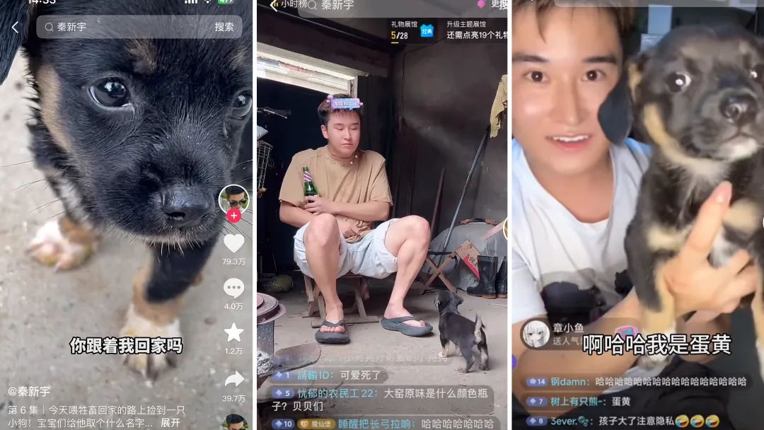 蛋黄是秦新宇回村后收养的一只小黑狗。它经常出现在短视频和直播中与他互动和玩耍,受到许多用户的喜爱。因此,每当蛋黄没有出现在秦新宇的直播中,用户就会在弹幕中疯狂地问:“蛋黄呢?蛋黄呢?”有一次,当他努力完成农业工作,来到手机前,发现大家都在关注蛋黄,感觉天塌下来了,忍不住导出: