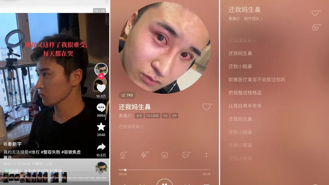 @秦新宇,今年七月 在Tiktok上发布视频,抱怨自己在一家整形医院整鼻失败的经历:去年年底,他在一家整形医生的建议下做了鼻子整形手术,但拆线两周后,他的鼻子开始下垂。咨询机构时得到的回复是“退肿后会恢复正常”。没想到,两个月后,他的鼻子下面挂得更厉害了,完全变成了鹰钩鼻。去机构修复一次也没用。在秦新宇想要讨论的时候,这个机构不但没有回复他的消息,还把他拉黑了。