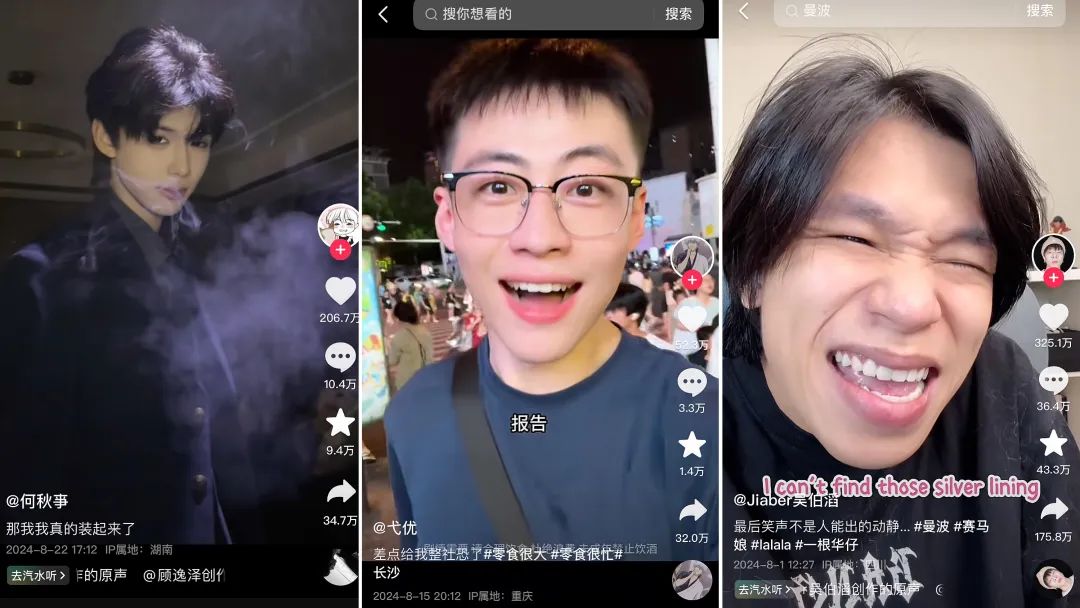 除了这两个账号,还有一些账号最近的表现特别抢眼。比如两个男博主@何秋和@游优,长相跑道久违,都有帅气的外表,以不同的视频风格吸引了大量女粉丝的目光。音乐博主@Jiaber吴伯滔 擅长以夸张、搞笑、情景演绎的方式进行歌曲翻唱和搞笑配音,视频风格极具辨识度,深受众多影迷的喜爱。