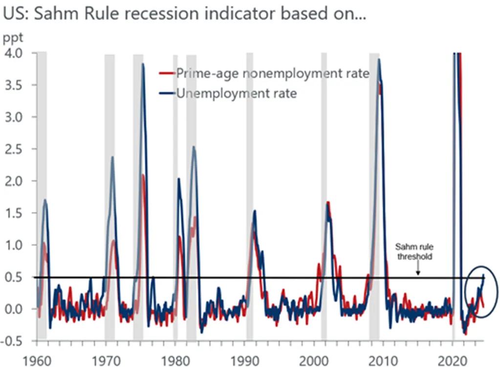 根据美国劳工统计局的数据,我们可以看到,2024年上半年,无论是平均收入(第一行)还是失业率(第二行)都有所恶化。在这些人中,3月份的平均工资是2020年中旬以来最低的,最广泛的失业率是2021年10月以来最高的。不仅如此,4、5月份美国失业率达到“萨姆法则”的触发线,后者通过历史数据整理,被称为经济衰退的前兆。