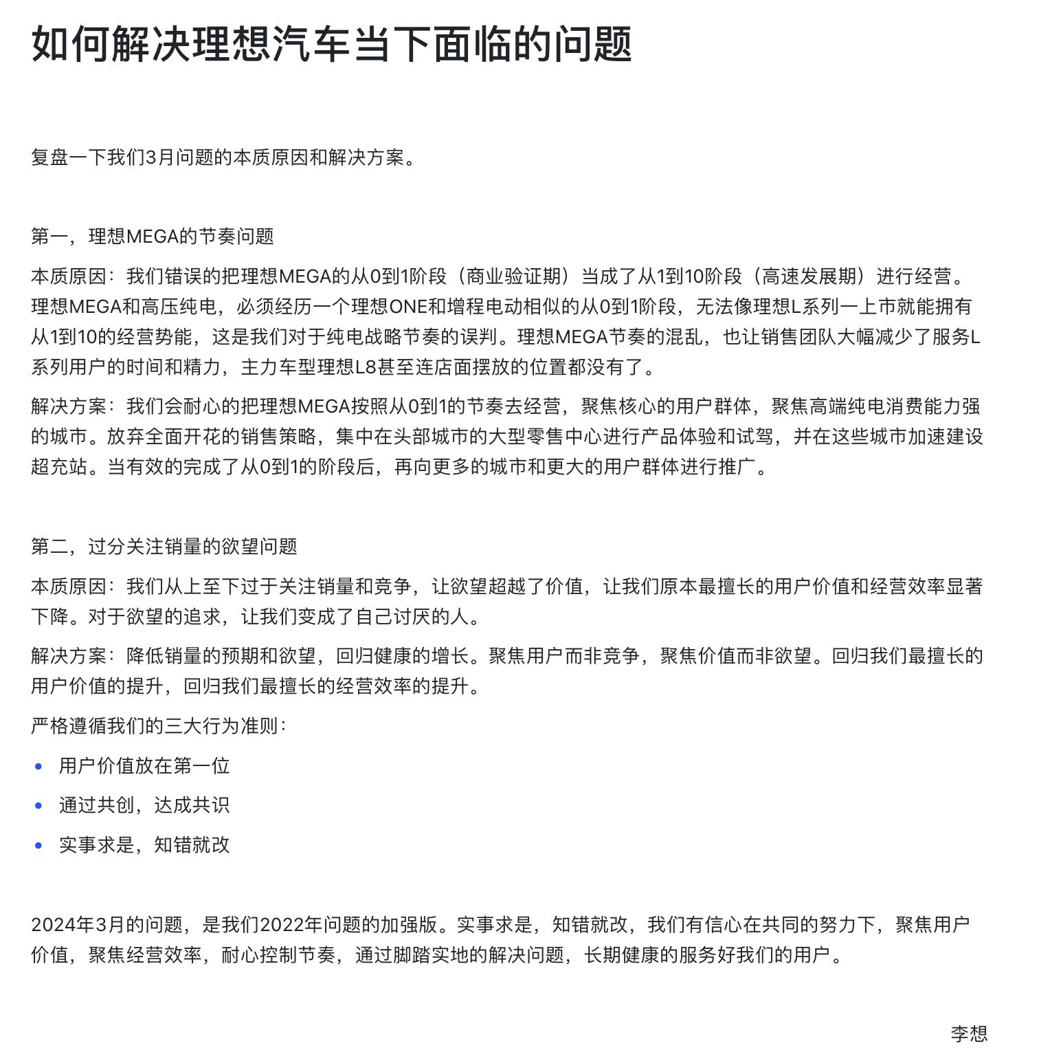 根据晚点报道,3月21日,李想在内部信中写道,理想错误地判断了纯电动战略节奏,错误地将MEGA “从0到1” 阶段(商业验证期)被视为 “从1到10” 经营阶段(快速发展阶段)。