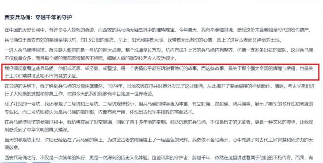 以“写一篇关于去西安兵马俑的游记”为例,夸克 CueMe “我仔细观察了这些兵马俑,他们要么思考,要么坚定,要么警惕,每一个表情似乎都在讲述他们的故事,这些故事是关于强大帝国的荣耀和荣耀,也是工匠精湛技艺和永恒智慧的见证”。