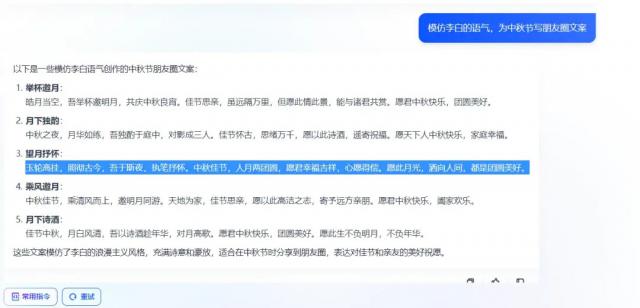 比如中秋节发朋友圈,简单的问候不仅容易“碰车”,而且特别生硬,很难给人留下深刻的印象。在夸克, CueMe 中国输入“模仿李白的语气,为中秋节写朋友圈文案”,更有艺术感的“玉轮高挂,照彻古今,吾于斯夜,写表达感情。中秋节,人月两团圆,祝你幸福吉祥,愿望得偿所愿”,给朋友圈更高的新鲜感。