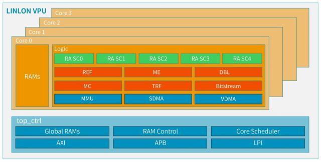 同时支持我国首批同时支持 H.266 Cpu,标准编码和解码视频,“玲珑” V510/V710 VPU 可编程处理架构采用多核多格式编解码融合,单核编码或解码性能可达到每秒。 4K 60 帧,根据端、边、云等不同场景的需要,各自提供 1-4 核、4-8 各种配备,如核等。“玲珑”不仅大大节省了存储空间和带宽成本,而且 V510/V710 VPU 还可以轻松按需配置,保证系统性能、功耗和面积的最佳平衡。