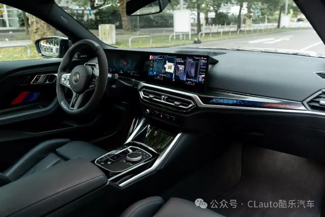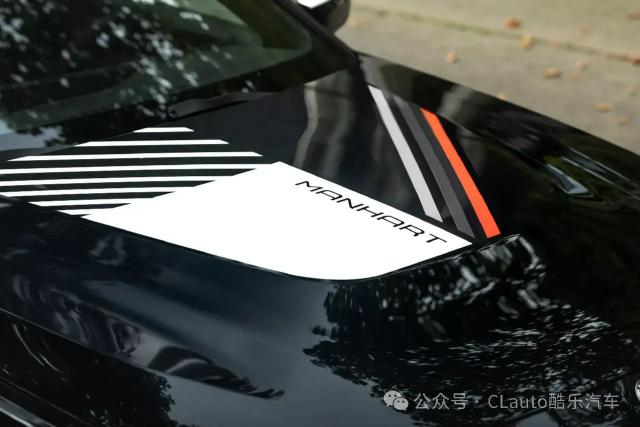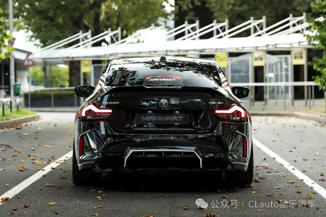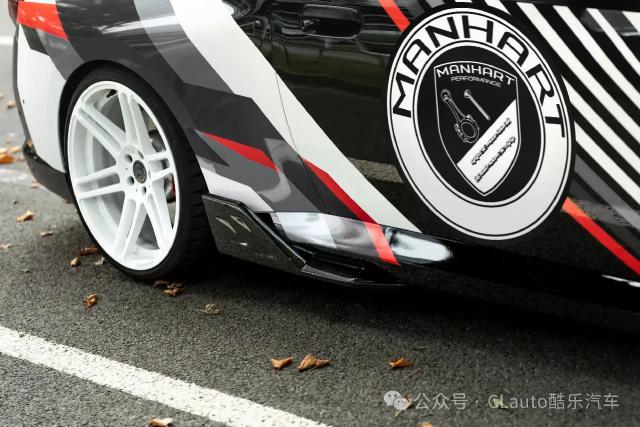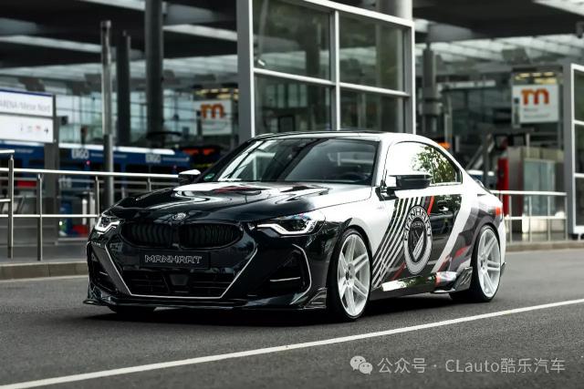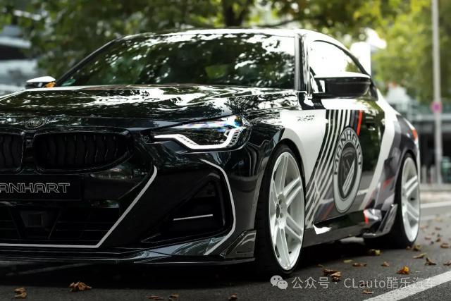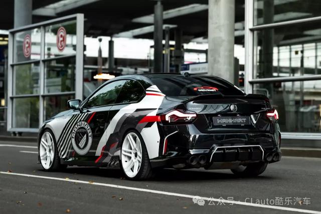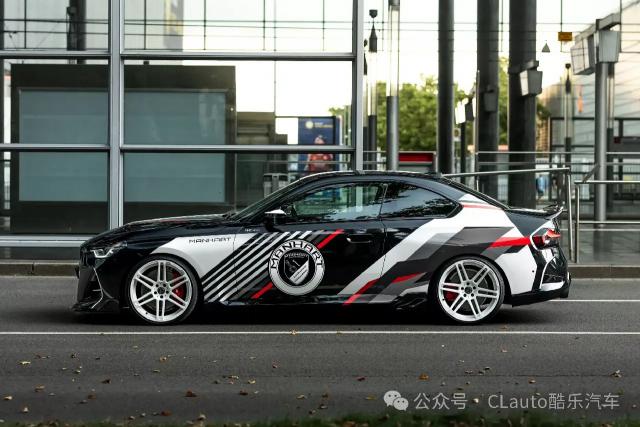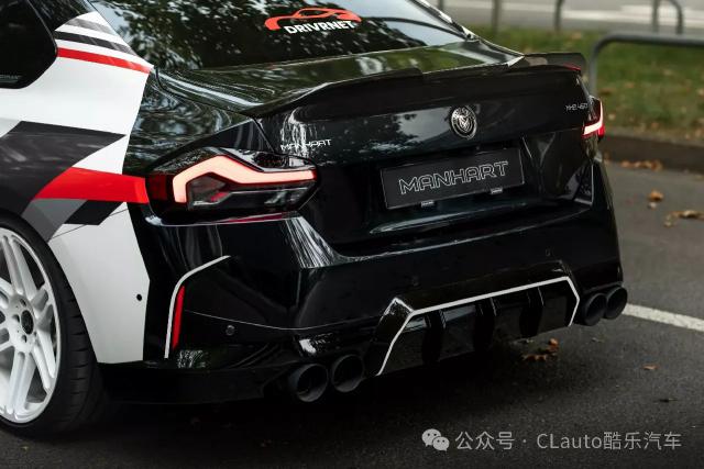 这款 M240i 外观很有特色,有跑车风格涂装,黑色主体车身配有白色、灰色和红色贴花设计。超大的 Manhart 这个标志也预示着它不是一个普通的。 2 系 Coupe。