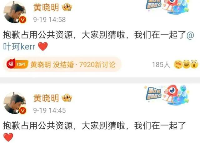 9 月 19 当天,黄晓明公开承认爱叶珂,官方宣布“对不起占用公共资源,别猜了,我们在一起了”,官方宣布了一位网友知道的秘密。