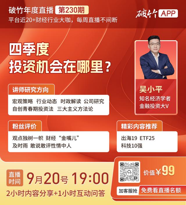 应当邀请破竹,今晚 7 点击,著名财经学者吴小平老师再一次亲临破竹直播间,带给大家——《第四季度投资机会在哪里?》主题直播,欢迎大家来直播间交流交流。