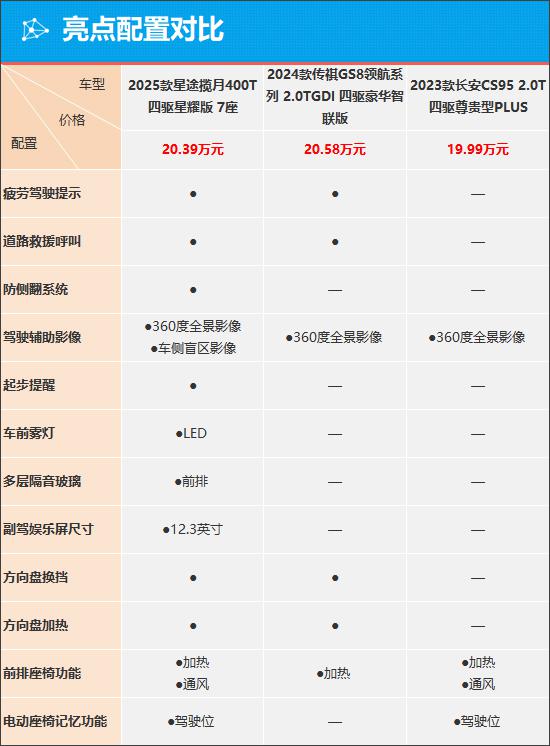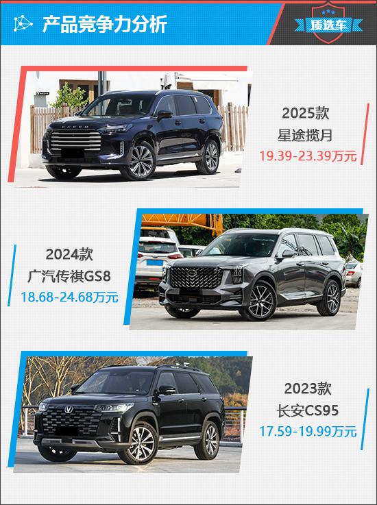 放眼国内 20 万元等级 SUV 市场,可选择的大尺寸自主选择 SUV 没有多少。和 2025 款星途揽月(以下简称星途揽月)价格、定位都是平等的,没有什么比这更好的了。 2023 款长安 CS95(以下简称长安) CS95)和 2024 款广汽传祺 GS8(以下简称传祺8) GS8),三者是直接竞争的产品。