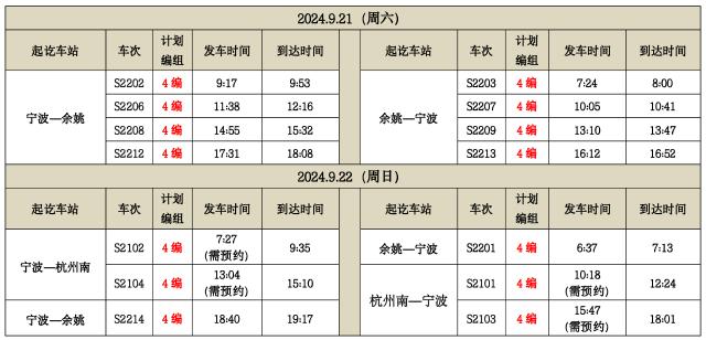 余姚至宁波 S2201 第二,宁波到余姚 S2214 第二,宁波到杭州南部 S2102 次、S2104 以及杭州南至宁波 S2101 次、S2103 临时调整次车次为 4 组织运营,其它车次组织不受影响。由于组织减少,宁波往返杭州南班次的可预约次数也将同步减少。