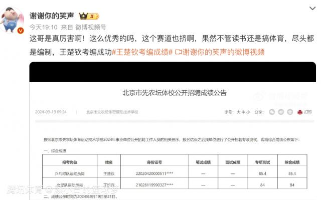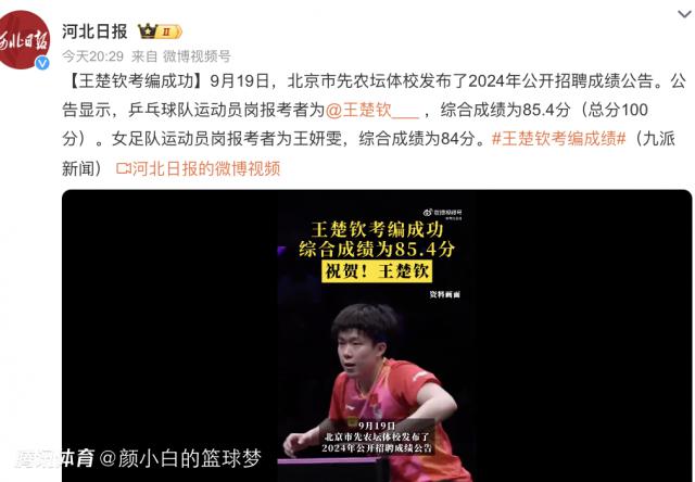北京时间 9 月 19 日本,北京市先农坛体校发布 2024 中国乒乓球运动员王楚钦2008年公开选拔结果公告。 85.4 分(总分 100 分数)成功报考(北京市先农坛体校)乒乓球运动员职位。