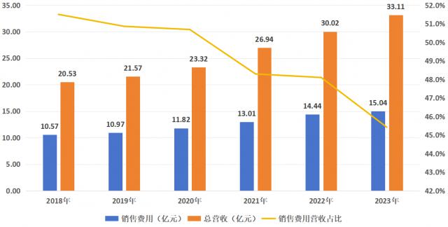 然而,虽然石膏市场的需求一直存在,但整体市场规模并不大,增长空间有限。随着竞争对手的增加,蛋糕自然会越来越低。为保证自己在激烈竞争中的领先地位,羚锐制药的销售费用常年保持在竞争中。 10 亿元以上,2023 年达到 15.04 同期R&D支出仅为亿元, 1.1 亿元。虽然销售费用在总收入中的比例持续下降,但是平方根的比例也在下降。 45% 之上。