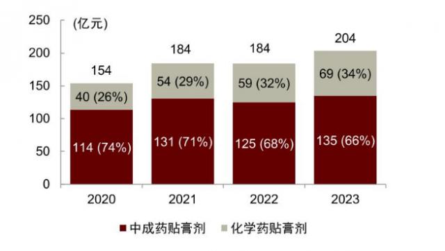 2023年中金公司数据显示 2000年我国药用贴膏行业的市场规模约为 204 中成药贴膏市场规模为亿元, 135 亿元,占总市场比例的亿元 66%;化学药膏的比例逐年增加,由 2020 年 26% 提升至 2023 年 34%。