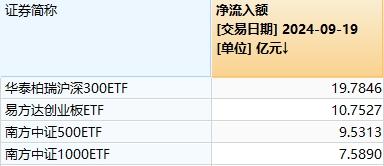 Wind 数据显示,是的 9 月 19 日的非货币 ETF 在市场上,易方达创业板 ETF 基金认购得到加强 7.09 十亿份,净流入额为 10.75 亿元;华夏上证科技创新板 50ETF 基金认购得到加强 6.93 亿份,净流入额为 4.72 亿元;华泰柏瑞沪深 300ETF 基金认购得到加强 6.07 十亿份,净流入额为 19.78 亿元。