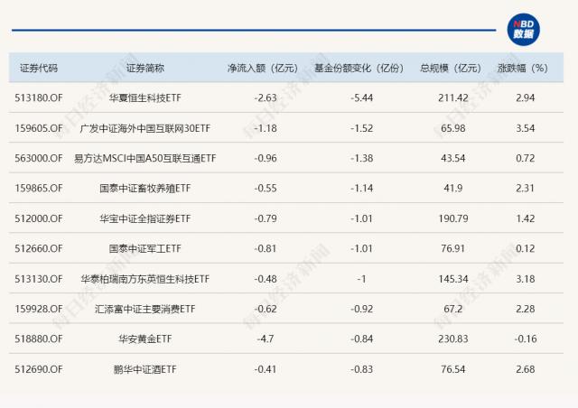 另外,华夏恒生技术 ETF 基金认购减少了 5.44 一一亿份,净流出额为 2.63 1亿元;广发中证海外中国互联网 30ETF 基金认购减少了 1.52 一一亿份,净流出额为 1.18 亿元;易方达 MSCI 中国 A50 数据共享 ETF 基金认购减少了 1.38 亿份,净流出额为 0.96 亿元。