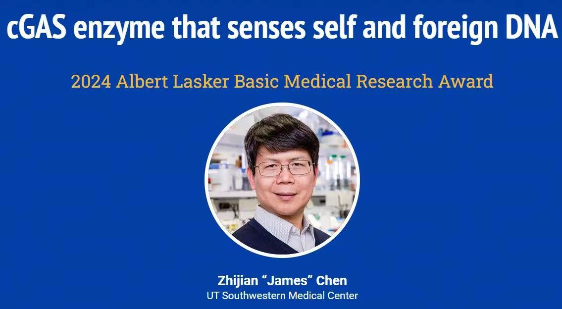 根据拉斯克医学奖官网,美国得克萨斯大学西南医学中心将于2024年获得拉斯克奖基础医学研究奖(UT Southwestern Medical Center)的陈志坚(Zhijian “James” Chen)教授,以独特的思维和一流的实验,表彰他发现自己和外源DNA的cGAS酶,解决了DNA如何刺激免疫和炎症反应的疑问。CGAS是哺乳动物抵抗微生物入侵的主要体系,它还可以促进抗肿瘤免疫。CGAS是哺乳动物抵抗微生物入侵的主要体系,也可以促进抗肿瘤免疫。在某些生理条件下,不适当的CGAS活性会导致自身免疫和炎症性疾病。这种酶为许多人类疾病提供了药物靶点,它产生的信号分子有望抵抗传染病和癌症。