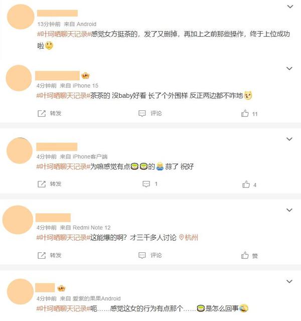 第一,叶珂晒出聊天截图时,其实关注的人并不多,热搜下全是网友调侃。“这个可以爆炸吗?只有三千多人讨论”、“感觉女人的行为有点茶”。