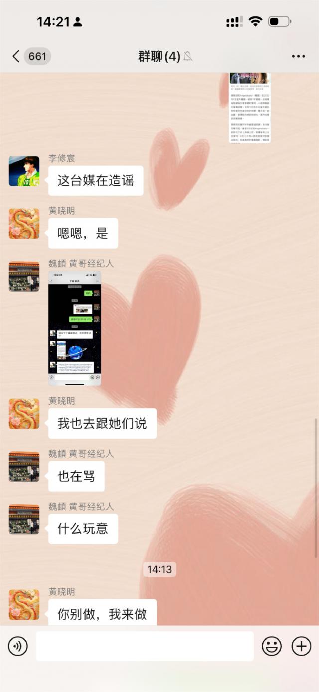 就在这个时候,台湾媒体又跳了出来,说“没结婚”,黄晓明没结婚的词条也迅速登上热搜。事件来了,是时候停止醇化,热度下降了。没想到叶珂又发布了一张聊天截图。截图中,叶珂给一个四组发了一张台湾媒体否认黄晓明的截图,然后黄哥的经纪人和黄晓明都说“台湾媒体在造谣”。经纪人准备找人理论,黄晓明却站出来说:“你别做,我来做”。
