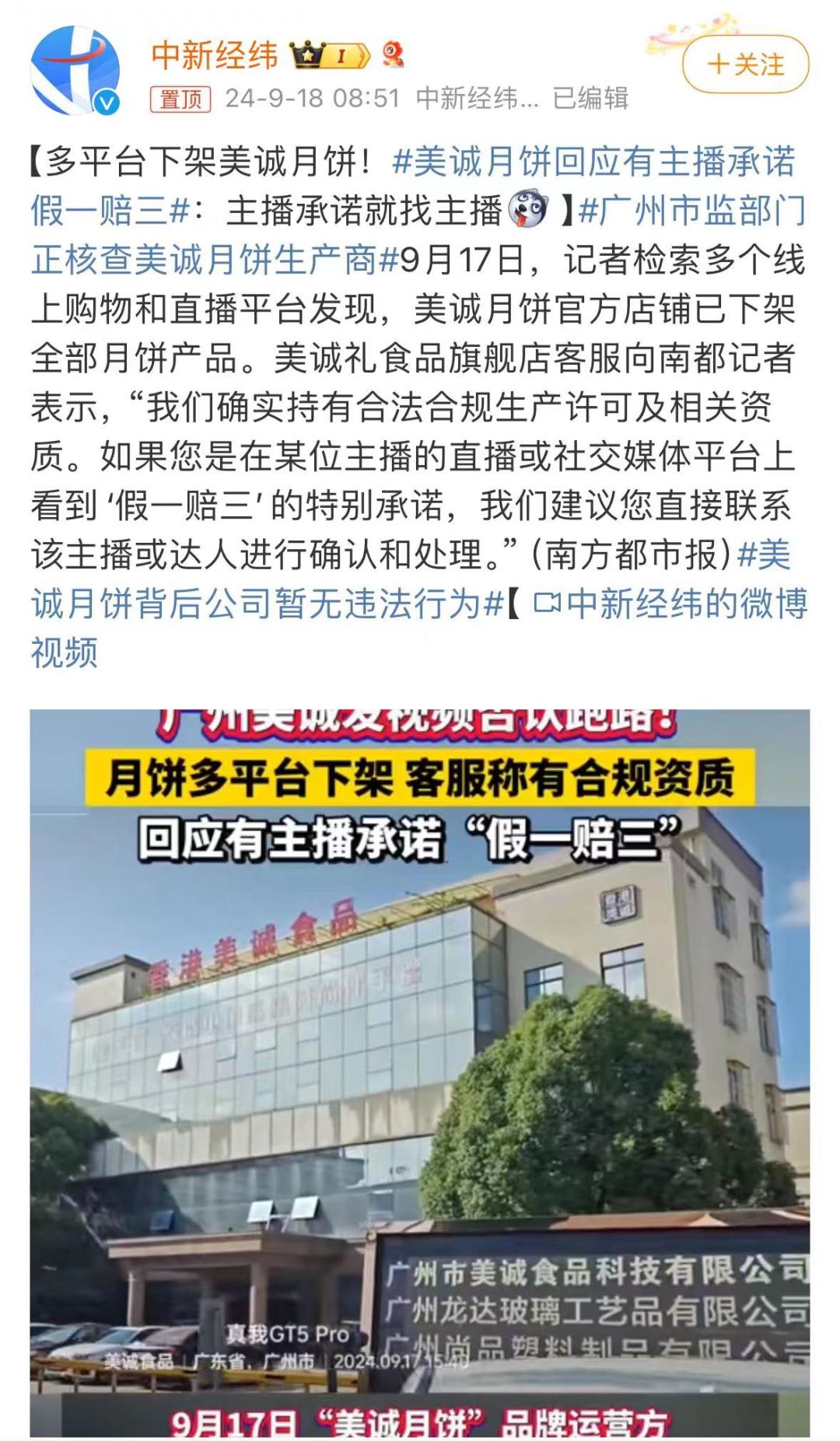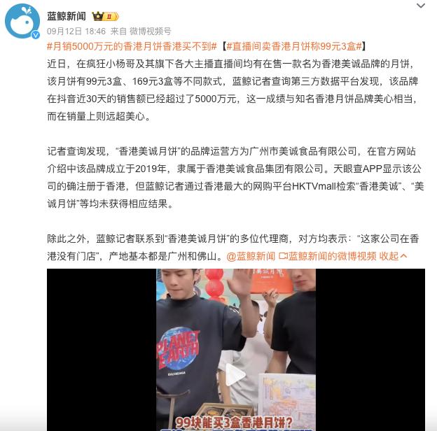 九月十二日,@蓝鲸新闻 我发了一份报道,自称“香港品牌”的高端月饼——美诚,在香港根本买不到...制造商实际上来自广州和佛山...只是品牌注册在香港...