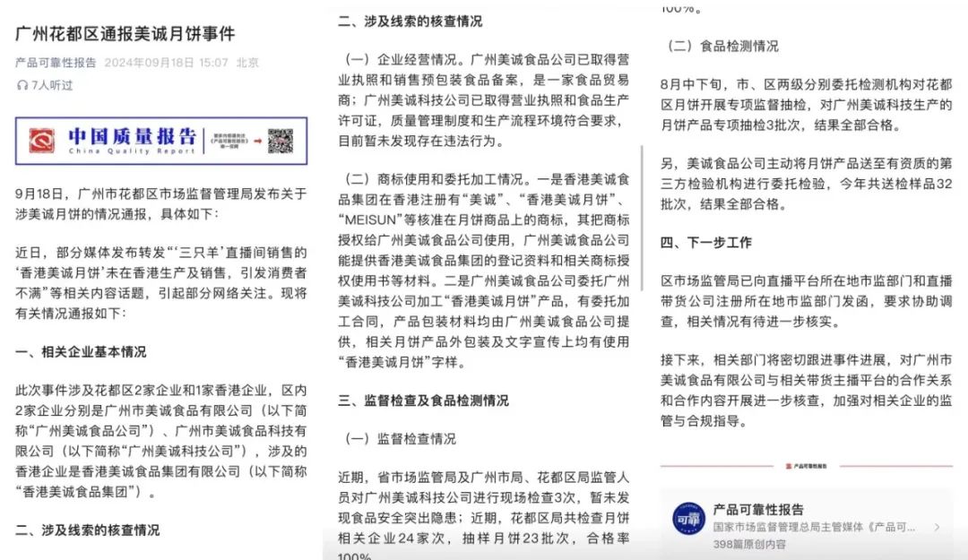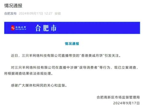 近日,三羊网络科技有限公司直播带来的“香港美诚月饼”备受关注。三羊网络科技有限公司涉嫌在直播间“误导消费者”,现已立案调查,将根据调查报告依法处理。