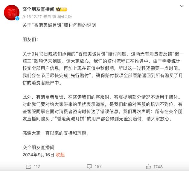 有消费者反馈说“退一赔三”钱还没到。请放心,我们的赔偿流程正在进行中。节后尽快完成“预付款”,确保所有赔偿款都以同样的方式返回所有购买月饼的客户账户。
