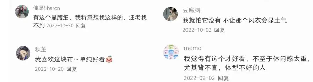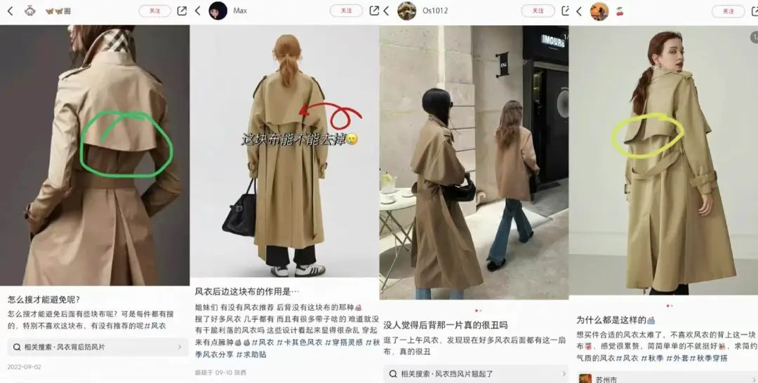 但是,虽然品牌推出了各种款式,但并没有吸引到所有的客户。很多人根本不希望风衣后面有这块布,不管怎么样。在小红书上,很多人吐槽这种“多余”的面料。很多网友说这块布不仅没用,而且穿上后看起来特别臃肿。而且由于材质问题,如果不打理,这块布可以翘出奇怪的形状,让人看起来不修边幅。
