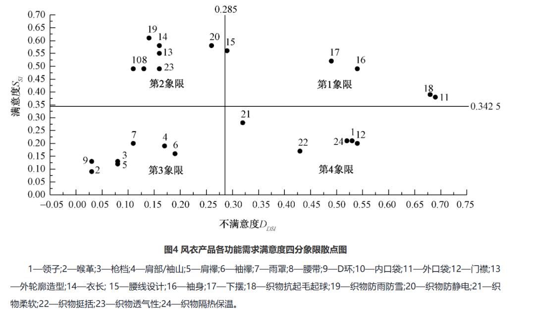 大连工业大学副教授穆芸发表的一篇文章讨论了消费者对风衣各个组成部分的需求和满意度。首先,研究了消费者对风衣产品功能的需求,并建立了风衣产品的需求清单。然后,通过问卷调查,我们可以得到风衣产品各功能需求的分类、满意度的象限散点图和权重分布,如下图所示。