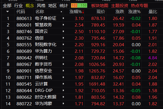 盘面上,信创概念股集体上涨,10余股涨停,如通达海、常山北明、南天信息、启明信息等。房地产股价波动上涨,渝开发,电子城市,大龙房地产涨停。卫星导航概念股盘中拉升,篝火电子,日海智能,海能达日线涨停。国有企业改革概念股持续活跃,保变电气、东方通信、大唐电信等10余股涨停。在下跌方面,创新药概念股进行了调整,海南海药等多芯下跌超过5%。板块方面,智慧政务、通信服务、贵金属、房地产等板块涨幅居前,中船系、光伏设备、创新药品、保险等板块跌幅居前。