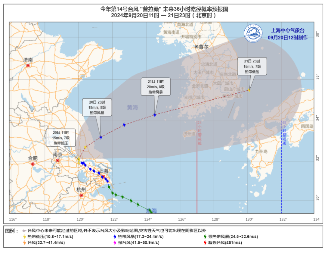 昨天(19日)晚上6时50分在浙江省舟山市岱山县沿海登陆后,今年第14号台风“普拉桑”的核心于19日21时45分左右在上海市奉贤区沿海登陆。登陆时,中心附近最大风力为9级,强度为热带风暴级。昨天半夜左右,“普拉桑”经嘉定区移出上海。今天8点,它变弱为热带低压。11点,中心位于江苏省泰兴市,强度为热带低压。据估计,这种低压将以每小时10-15公里的速度向东北移动,强度变化不大。