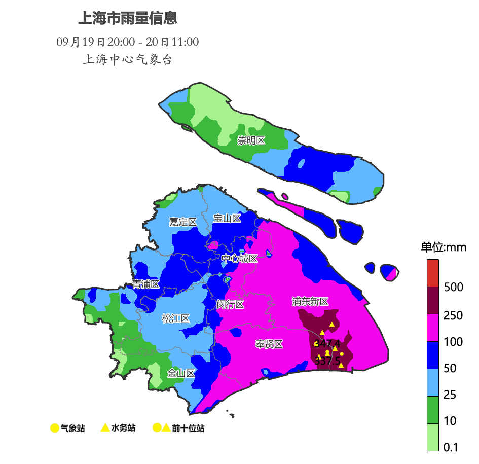 据统计,19日20:00至20日11:00,全市普遍下降至暴雨,其中浦东大部分、奉贤等地发生暴雨,奉贤四团镇、浦东泥城镇发生暴雨。浦东泥城镇彭镇水务站6小时降雨量308.08.0mm,奉贤四团杨家宅气象观测站6小时降雨327.7.mm,自1978年上海有完整的小时降雨观测数据以来,最大的6小时降雨量。