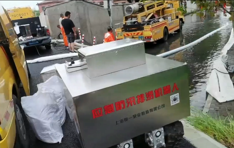 上海市金山区部分街镇路面积水,排水机器人帮助抢排水。