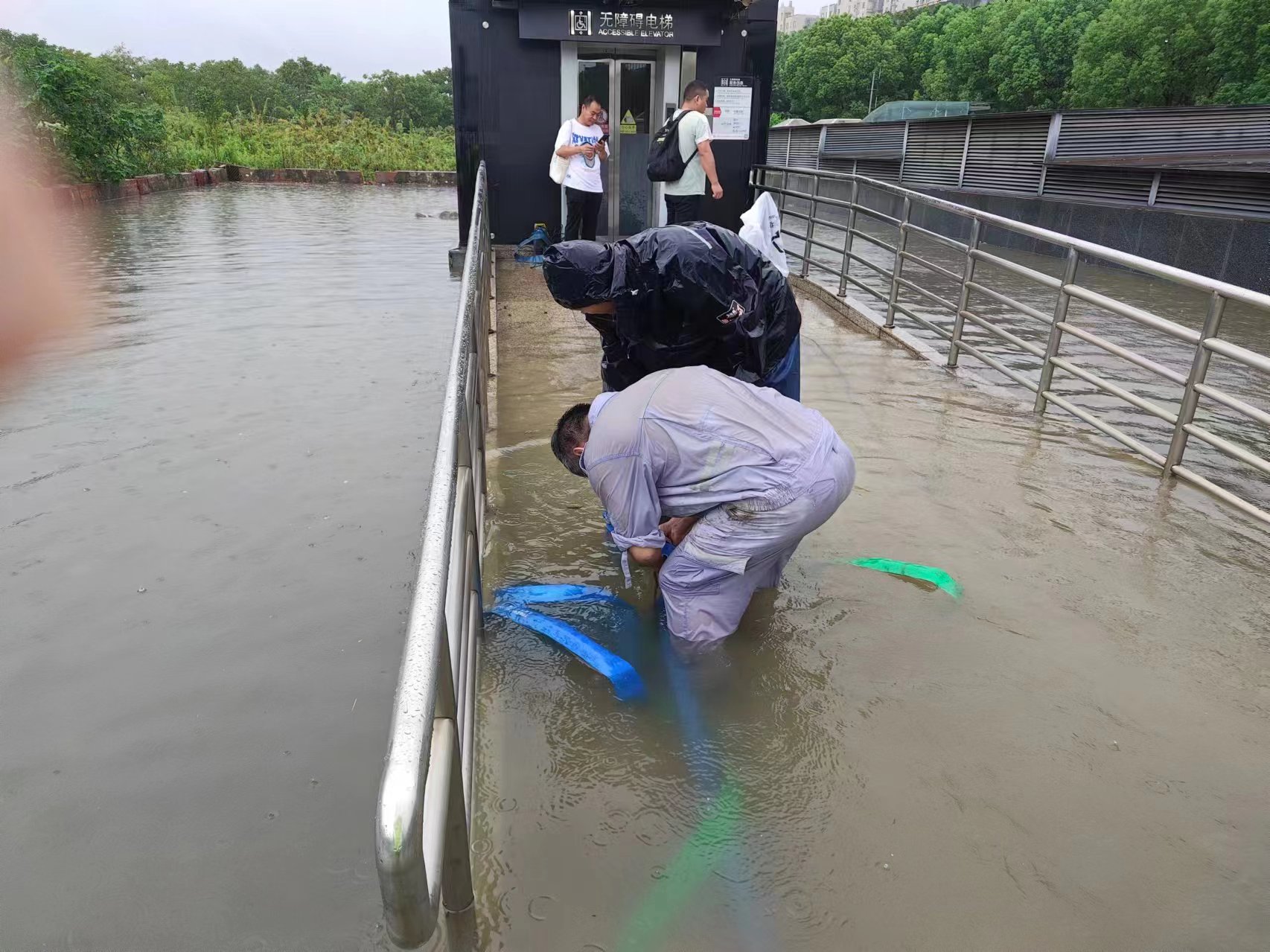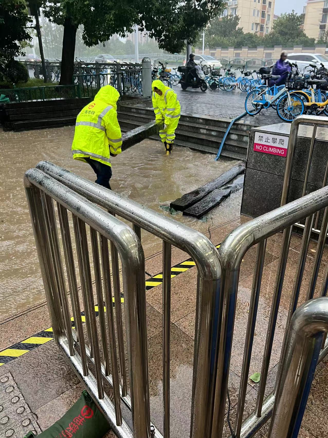上海地铁还表示,随着台风带来的持续降雨,6号线华夏西路站外无障碍电梯区积水严重。车站工作人员操作水带、排水泵等设施,确保储水快速排出。
