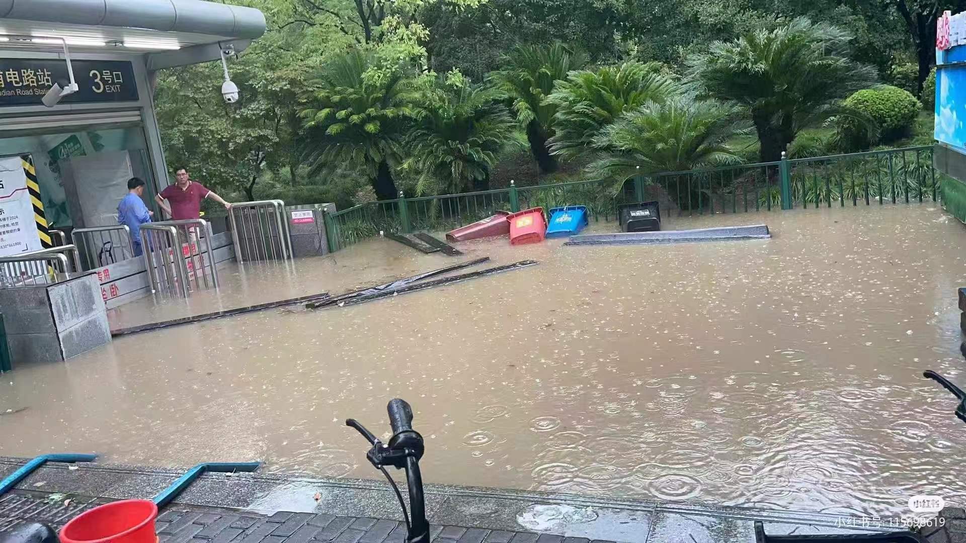 9月20日上午,台风“普拉桑”给上海带来暴雨,上海部分地区出现道路积水。其中,网上流传着上海地铁浦电路站3号口站外道路积水的图片。